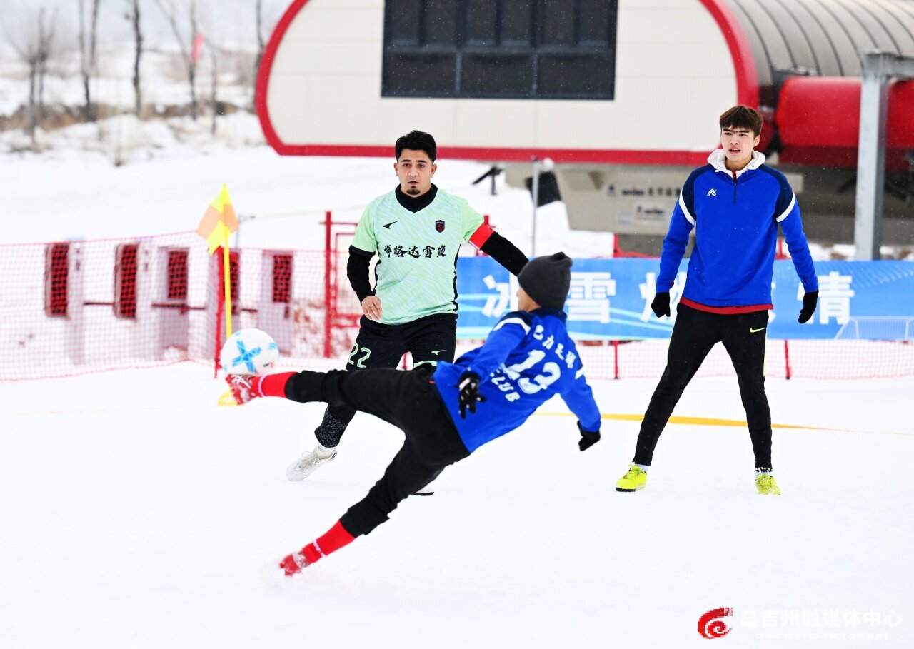 12月6日,昌吉州“冬游天山别样暖”冰雪嘉年华暨阜康市冰雪风情季、天山天池国际滑雪场开板仪式活动现场,运动员在进行雪地足球比赛。