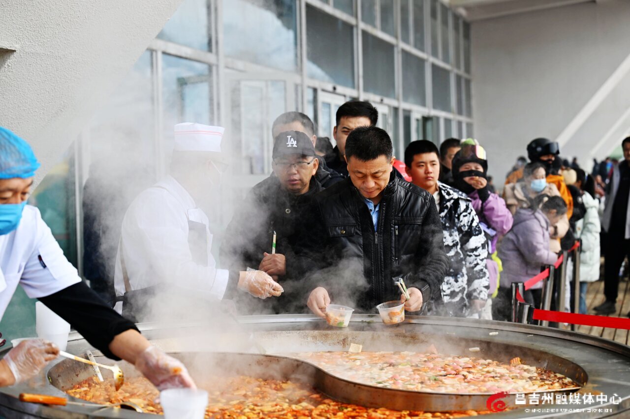 12月6日,阜康市天山天池国际滑雪场,游客在排队品尝免费的火锅。