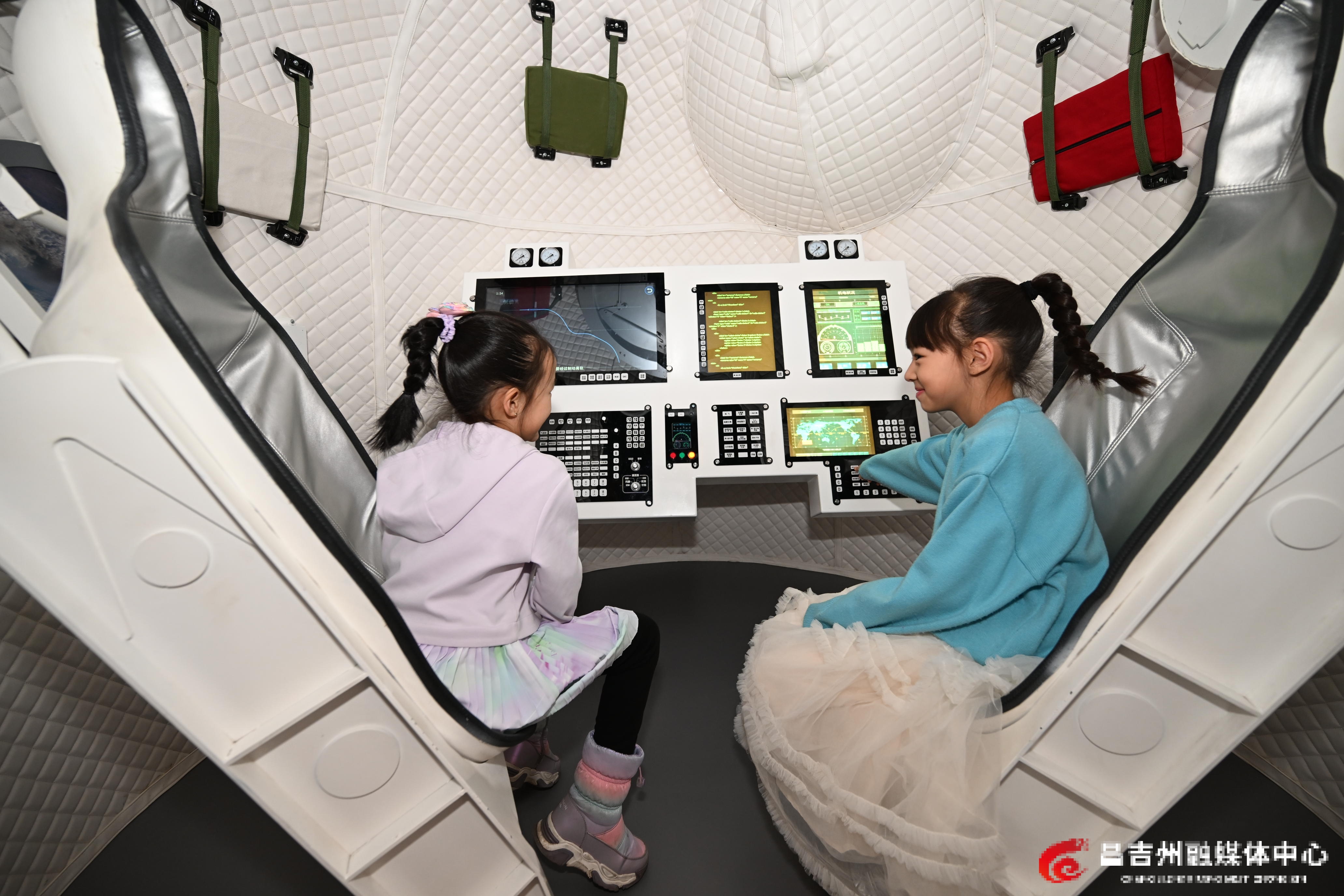 2月2日,昌吉科技馆,小朋友在火箭返回舱模型中参观体验。