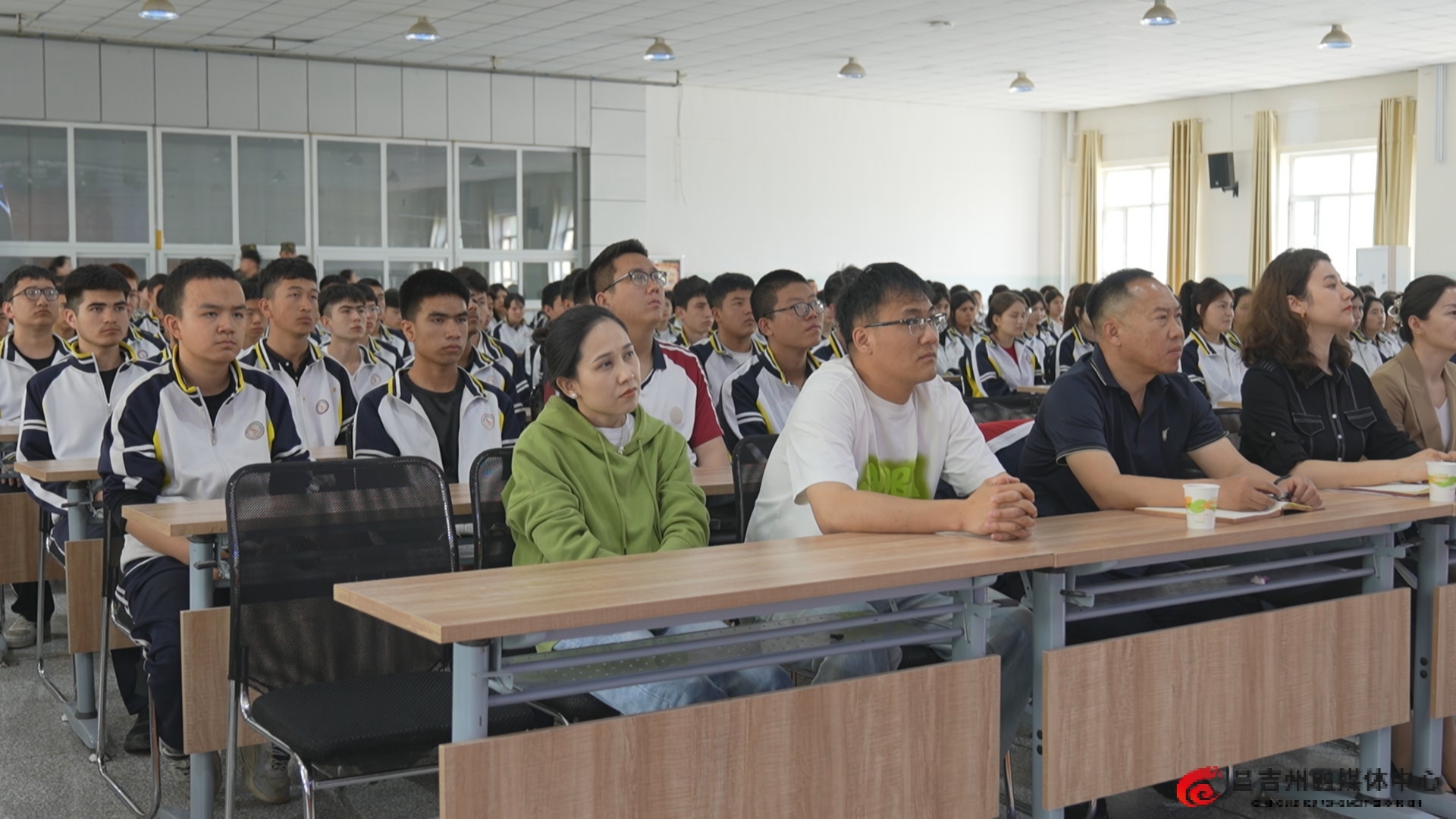 4月17日,自治区“铸牢中华民族共同体意识 建设社会主义现代化新疆”百姓巡回宣讲团走进玛纳斯县,玛纳斯中等职业技术学校师生认真聆听宣讲。通讯员谷雅萍 摄