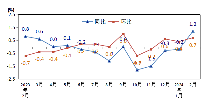 图1:2023年2月-2024年2月昌吉市居民消费价格同环比涨跌幅