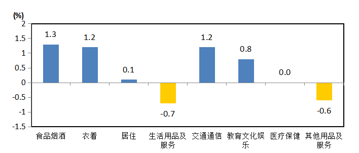 八大类消费品及服务项目价格环比呈现“五涨二降一持平”态势。其中,食品烟酒价格上涨1.3%,衣着和交通通信价格均上涨1.2%,教育文化娱乐价格上涨0.8%,居住价格上涨0.1%;生活用品及服务价格下降0.7%,其他用品及服务价格下降0.6%;医疗保健价格与上月持平。