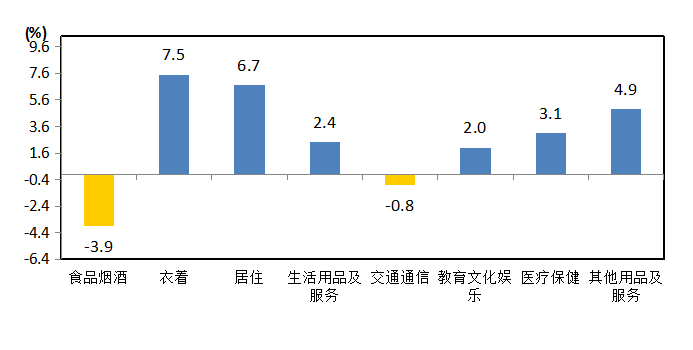 八大类消费品及服务项目价格同比呈现“六涨二降”态势。其中,衣着价格上涨7.5%,居住价格上涨6.7%,其他用品及服务价格上涨4.9%,医疗保健价格上涨3.1%,生活用品及服务价格上涨2.4%,教育文化娱乐价格上涨2.0%;食品烟酒价格下降3.9%,交通通信价格下降0.8%。