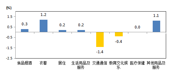 9月份,八大类消费品及服务价格环比五涨二降一持平。其中,衣着价格上涨1.2%,其他用品及服务价格上涨1.1%,食品烟酒价格上涨0.3%,居住和生活用品及服务价格均上涨0.2%;交通通信价格下降1.4%,教育文化娱乐价格下降0.4%;医疗保健价格与上月持平。