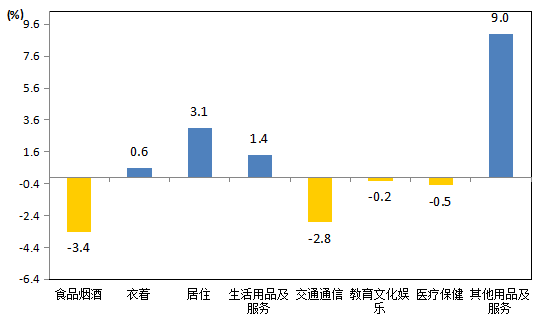 9月份,八大类消费品及服务价格同比四涨四降。其中,其他用品及服务价格上涨9.0%,受上年同期价格基数较低影响,居住价格上涨3.1%,生活用品及服务价格上涨1.4%,秋装换季上新,衣着价格上涨0.6%;食品烟酒价格下降3.4%,交通通信价格下降2.8%,医疗保健价格下降0.5%,教育文化娱乐价格下降0.2%。