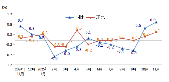 11月,工业品价格环比上涨0.7%,影响居民消费价格指数上涨0.24个百分点。受季节因素影响,冬季服装新品上市,男式服装、女式服装、儿童服装价格环比分别上涨1.7%、1.8%、3.3%;受国际黄金价格攀升影响,首饰手表价格环比上涨2.5%。其中,金饰品价格上涨7.4%。