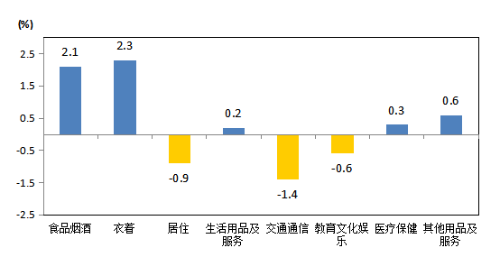 11月,八大类消费品及服务价格环比五涨三降。其中,衣着价格上涨2.3%,食品烟酒价格上涨2.1%,其他用品及服务价格上涨0.6%,医疗保健价格上涨0.3%,生活用品及服务价格上涨0.2%;交通通信价格下降1.4%,居住价格下降0.9%,教育文化娱乐价格下降0.6%。