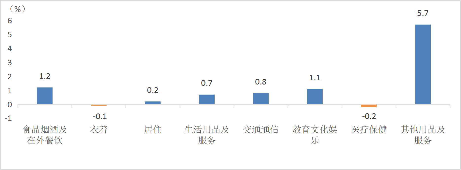 1月份,食品烟酒及在外餐饮价格上涨1.2%,影响CPI(居民消费价格指数)上涨约0.36个百分点。食品中,鲜菜价格下降3.2%,影响CPI下降约0.08个百分点;水产品价格下降1.9%,影响CPI下降约0.01个百分点;鲜果价格上涨11.4%,影响CPI上涨约0.22个百分点;畜肉类价格上涨2.2%,影响CPI上涨约0.10个百分点;蛋类价格上涨1.7%,影响CPI上涨约0.01个百分点。八大类消费品及服务价格环比五涨三降。其中,其他用品及服务价格上涨5.7%,食品烟酒及在外餐饮价格上涨1.2%,教育文化娱乐价格上涨1.1%,交通通信价格上涨0.8%,生活用品及服务价格上涨0.7%,居住价格上涨0.2%;衣着价格下降0.1%,医疗保健价格下降0.2%。