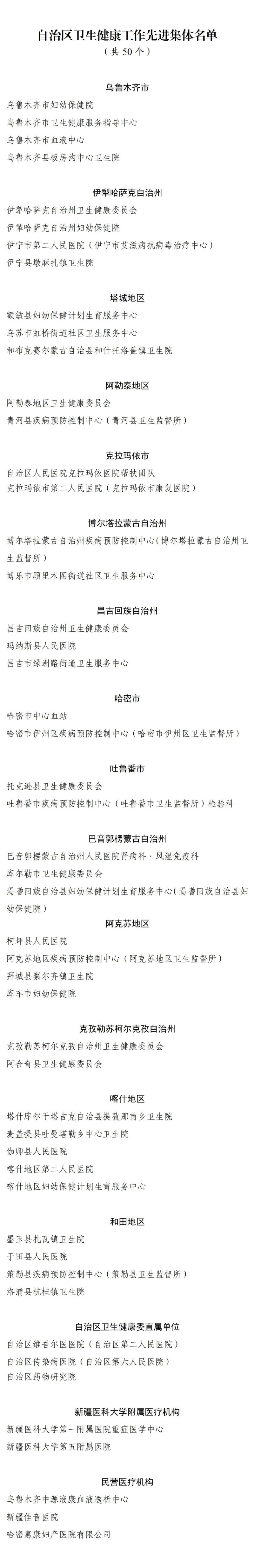 石榴云/新疆日报讯(记者苏璐萍报道)10月22日,记者从自治区卫生健康委获悉,为发挥先进典型示范引领作用,激励全区卫生健康系统广大干部职工奋发有为,经自治区党委和政府批准,决定授予乌鲁木齐市妇幼保健院等50个单位“自治区卫生健康工作先进集体”称号,授予孙高峰等100名同志“自治区卫生健康工作先进个人”称号。