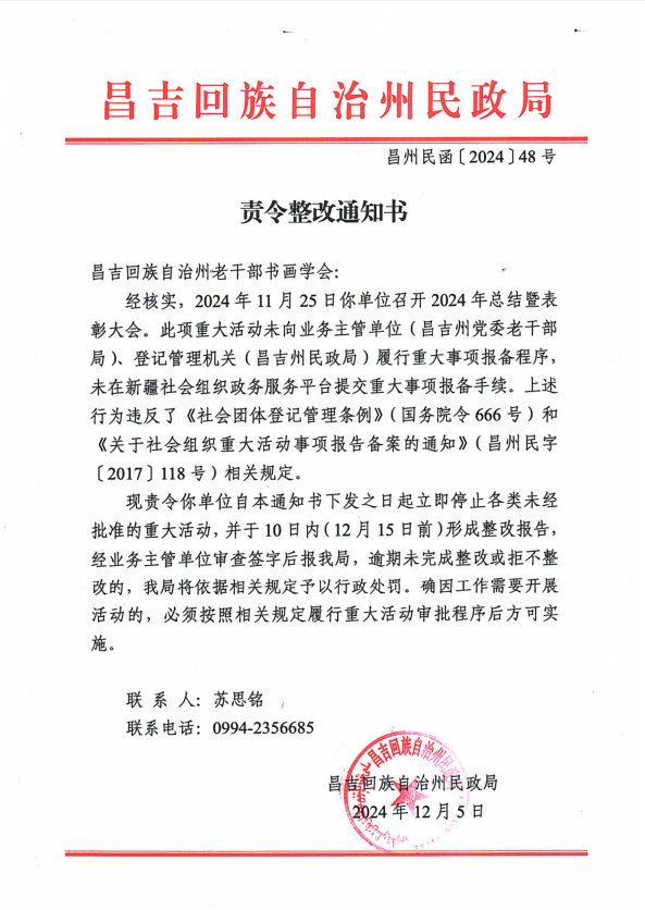 责令整改通知书(昌吉回族自治州老干部书画学会)
