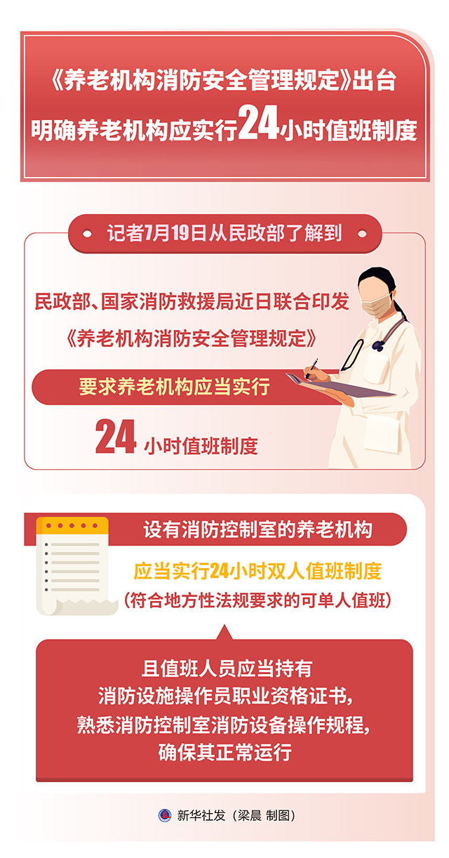记者7月19日从民政部了解到,民政部、国家消防救援局近日联合印发《养老机构消防安全管理规定》,要求养老机构应当实行24小时值班制度。设有消防控制室的养老机构,应当实行24小时双人值班制度(符合地方性法规要求的可单人值班),且值班人员应当持有消防设施操作员职业资格证书,熟悉消防控制室消防设备操作规程,确保其正常运行。