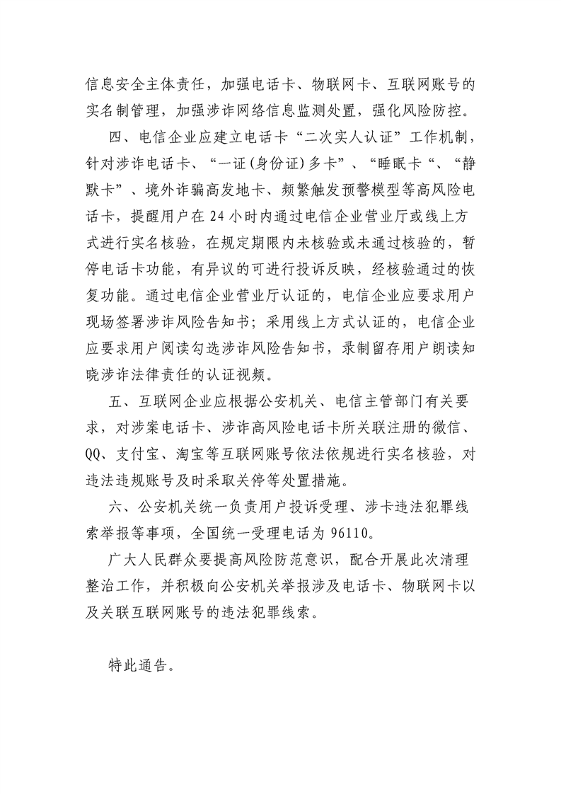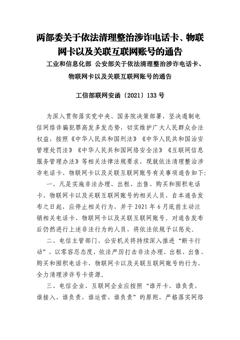 两部委关于依法清理整治涉诈电话卡、物联网卡以及关联互联网账号的通告