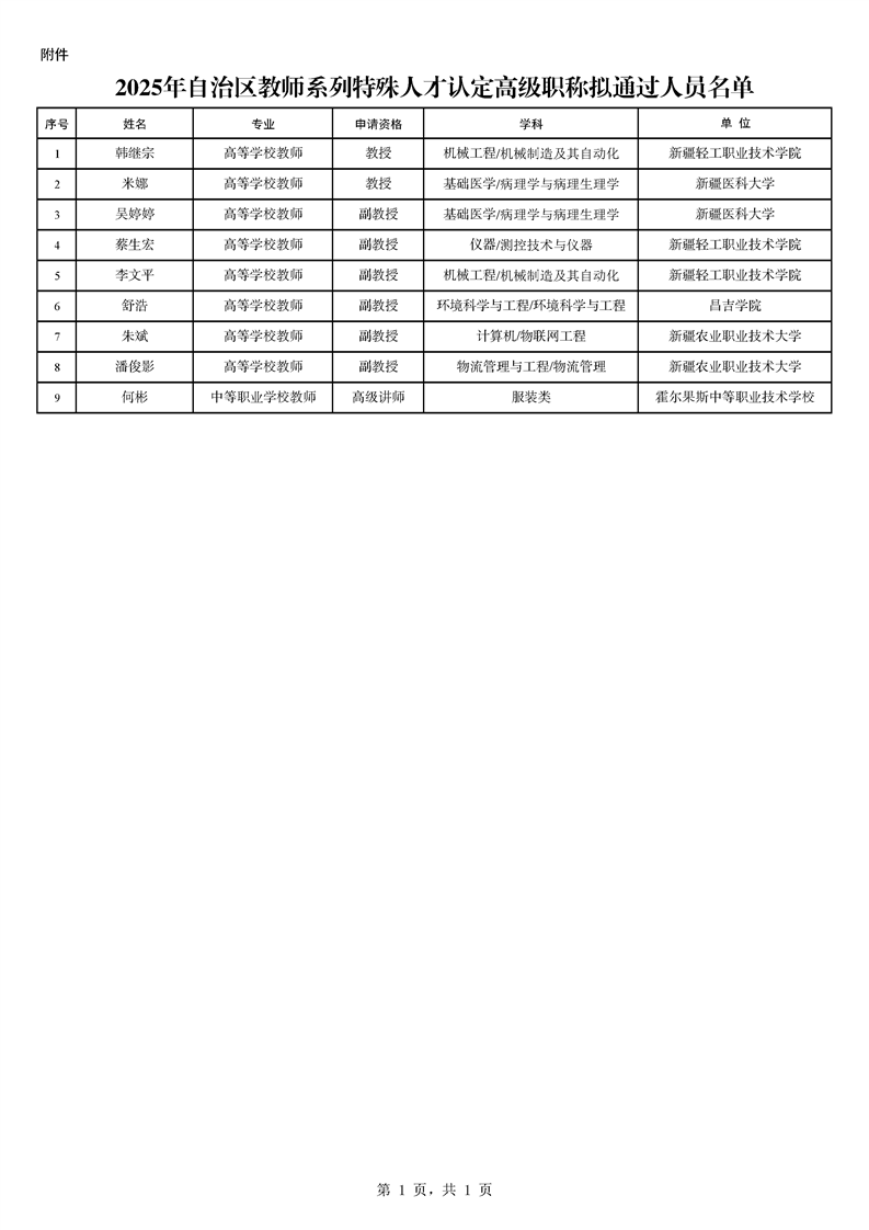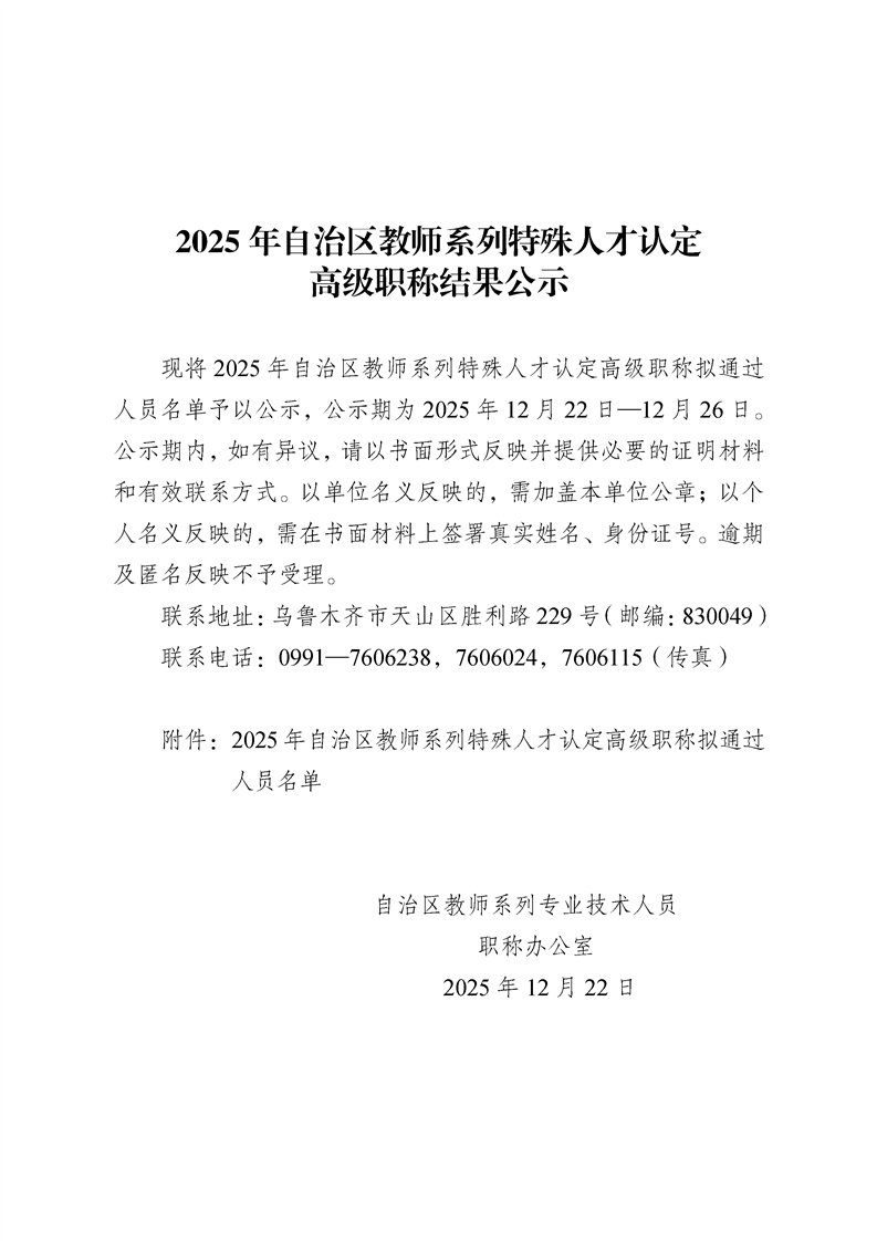 【义务教育】2025年自治区教师系列特殊人才认定高级职称结果公示