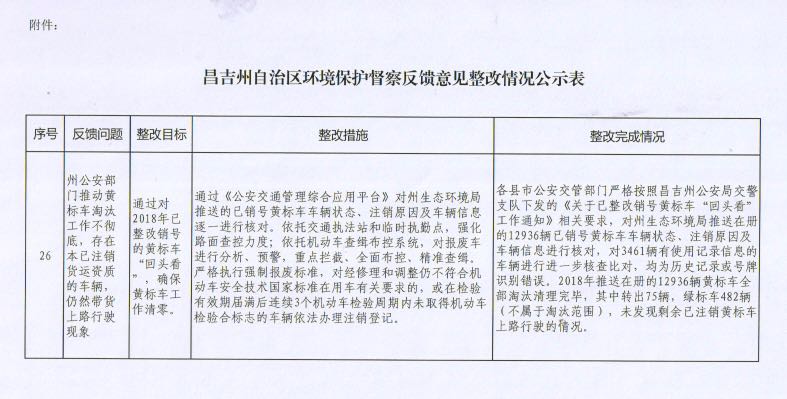 根据《昌吉州贯彻落实生态环境保护督察反馈问题整改验收销号工作办法(试行)》(昌州环督察[2022]3号)的相关规定,秉持“整改一个、验收一个、公开一个、销号一个、备案一个”的原则,昌吉州公安局已完成自治区序号问题二十六项整改任务,公示具体内容请见附件。