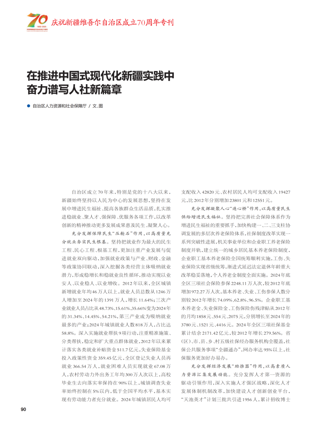 编者按:自治区人力资源和社会保障厅在《今日新疆》“庆祝新疆维吾尔自治区成立70周年专刊”发表题为《在推进中国式现代化新疆实践中奋力谱写人社新篇章》的署名文章,系统回顾了自治区成立以来,特别是党的十八大以来人社事业取得的历史性成就。文章以详实数据和发展实践,全面展现了新疆坚持在发展中保障和改善民生的生动图景,充分彰显了新时代党的治疆方略的成功实践,折射出各族人民获得感、幸福感、安全感的显著增强。