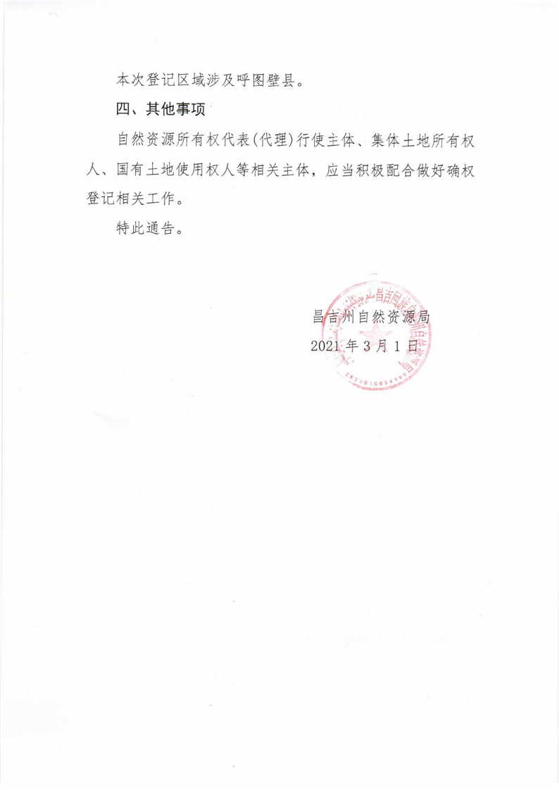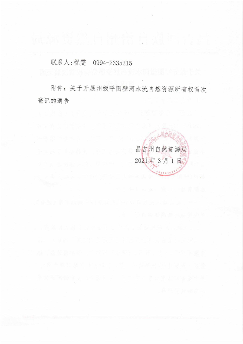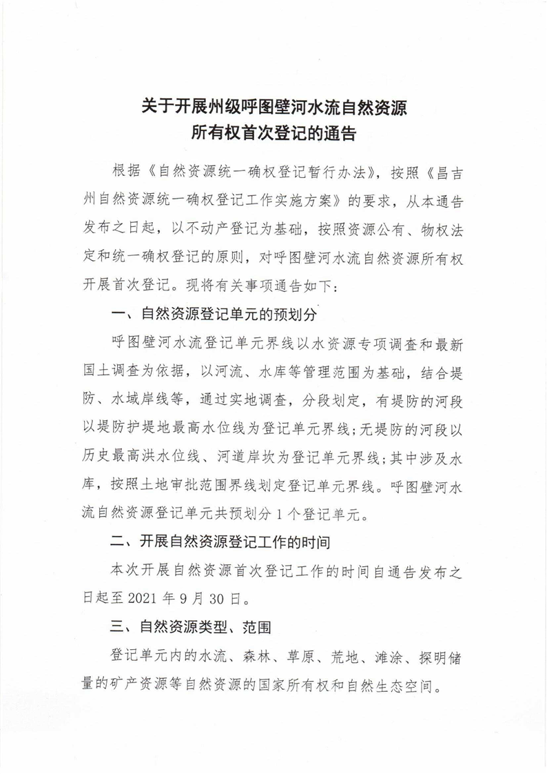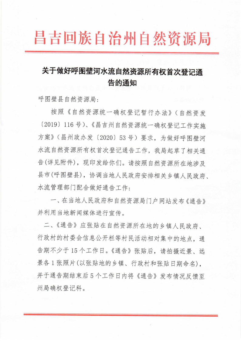关于做好呼图壁河水流自然资源所有权首次登记通告的通知