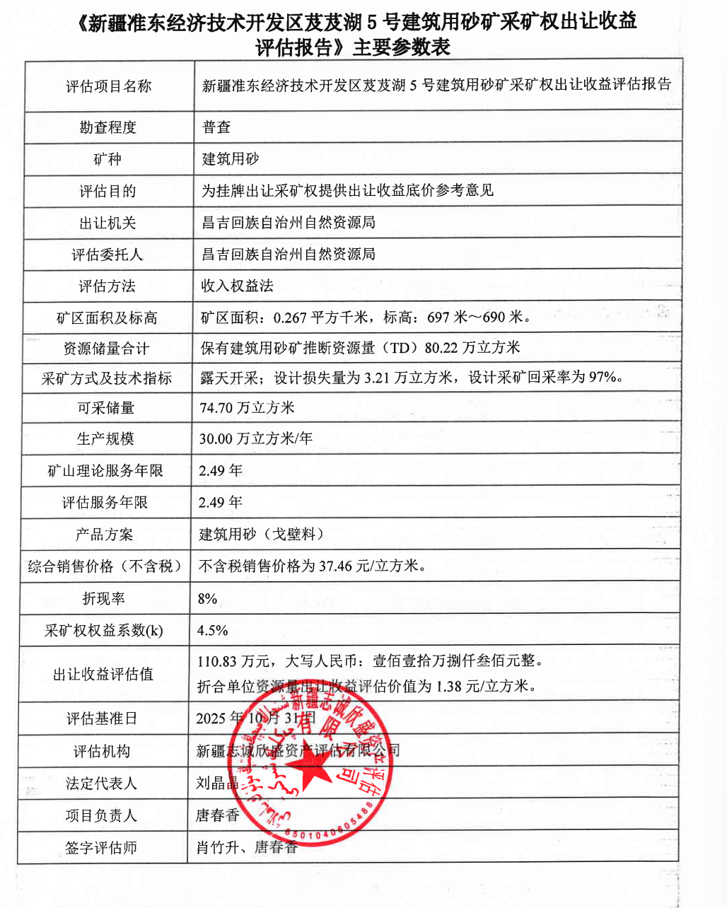 2.《新疆准东经济技术开发区芨芨湖4号建筑用砂矿采矿权出让收益评估报告》主要参数表