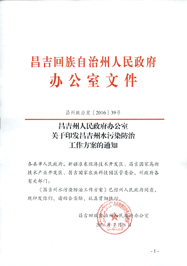 昌吉州人民政府办公室关于印发昌吉州水污染防治工作方案的通知