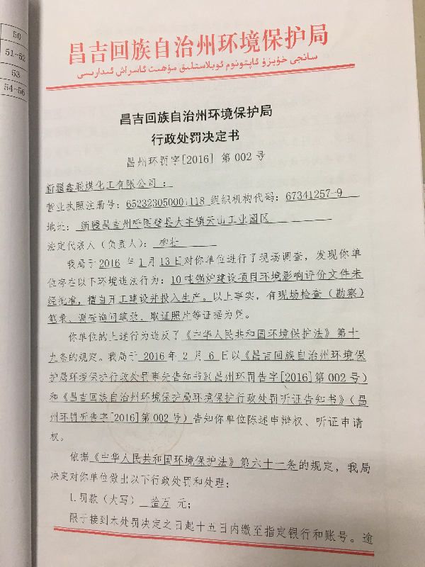 新疆鑫联煤化工有限公司环境违法行为行政处罚文书