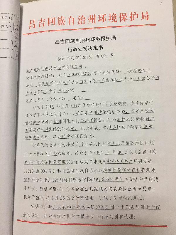昌吉高新科创污水处理有限公司环境违法行为行政处罚文书