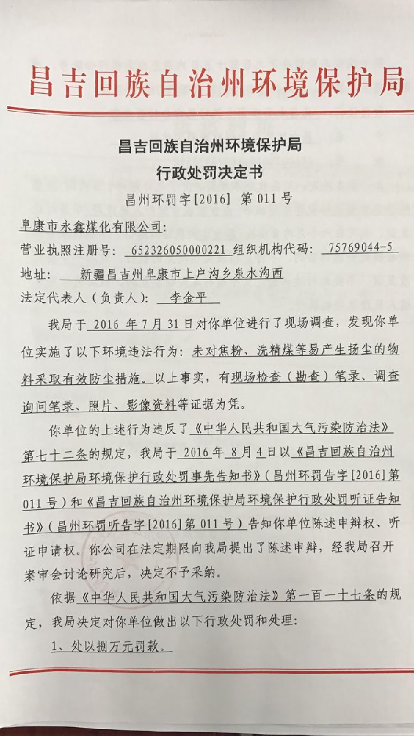 阜康市永鑫煤化有限公司环境违法行为行政处罚文书