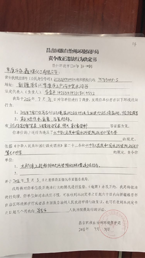 阜康市永鑫煤化有限公司环境违法行为行政处罚文书