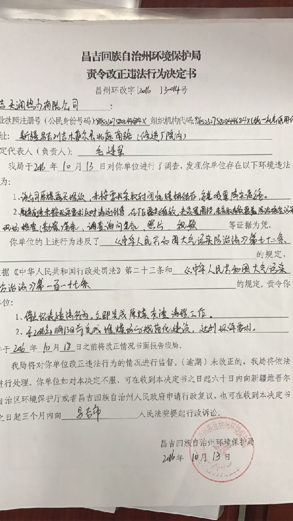 昌吉天润热力有限责任公司环境违法行为行政处罚文书