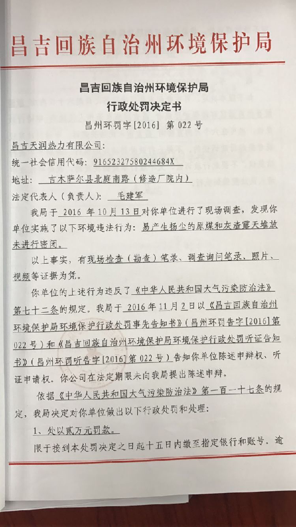昌吉天润热力有限责任公司环境违法行为行政处罚文书