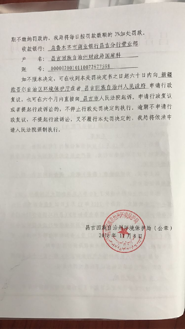 昌吉天润热力有限责任公司环境违法行为行政处罚文书