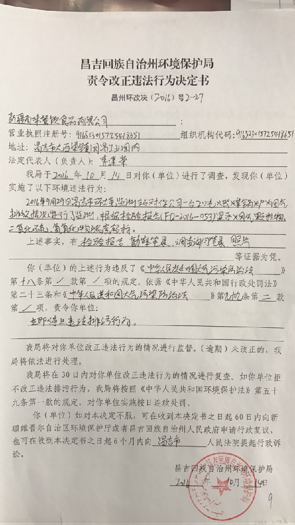 新疆百味餐饮食品有限公司环境违法行为行政处罚文书