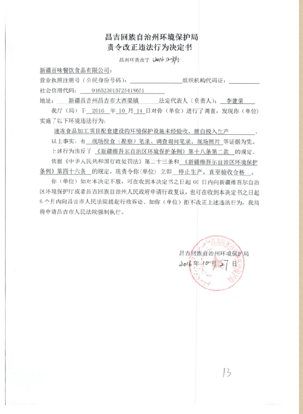 新疆百味餐饮食品有限公司环境违法行为行政处罚文书