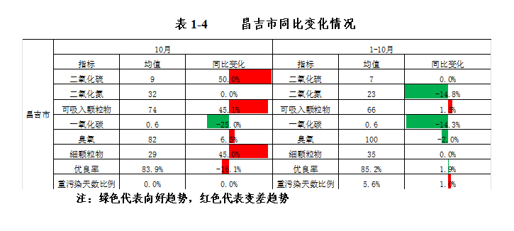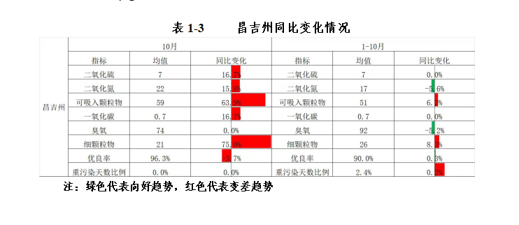 (五)按照城市环境空气质量综合指数评价,10月份全州各县市综合指数由低到高排名依次为木垒县、吉木萨尔县、奇台县、玛纳斯县、阜康市、呼图壁县、昌吉市。