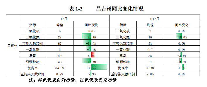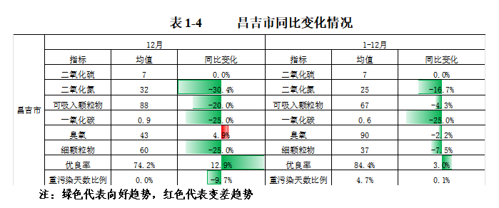 昌吉市1-12月优良天数比例为84.4%,同比上升3.0%,重污染天数比例为4.7%,同比上升0.1%;PM10平均浓度为67µg/m3,同比下降4.3%;PM2.5平均浓度为37µg/m3,同比下降7.5%;SO2平均浓度为7µg/m3,同比持平;NO2平均浓度为25µg/m3,同比下降16.7%;CO平均浓度为0.6mg/m3,同比下降25.0%;臭氧(日最大8小时滑动平均)为90µg/m3,同比下降2.2%。见表1-4。