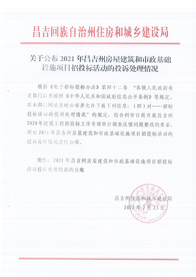 关于公布2021年昌吉州房屋建筑和市政基础设施项目招投标活动的投诉处理情况