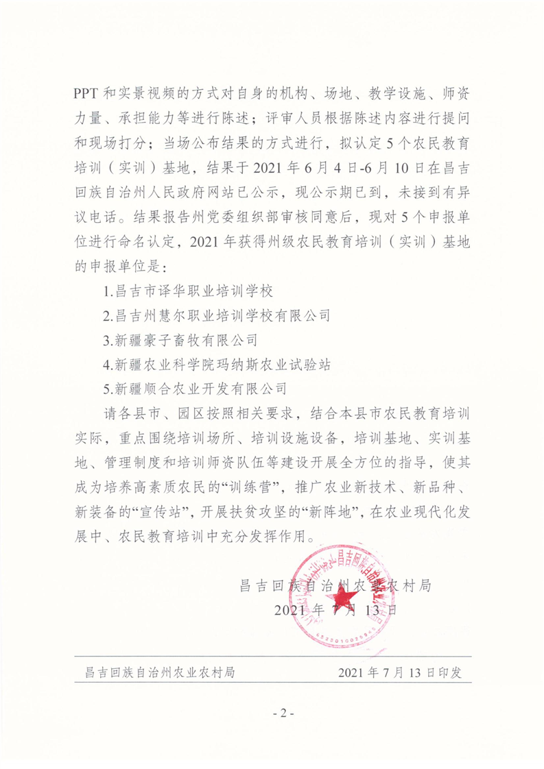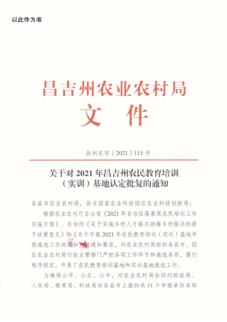 关于对2021年昌吉州农民教育培训(实训)基地认定批复的通知