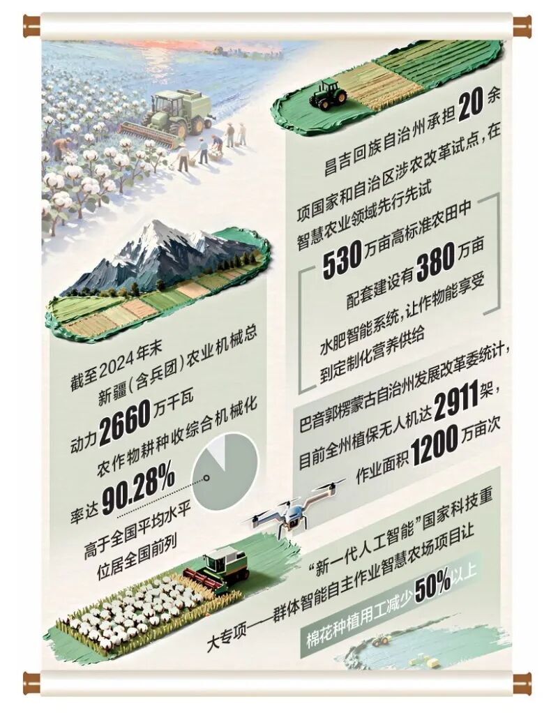 截至2024年末,新疆(含兵团)农业机械总动力2660万千瓦。农作物耕种收综合机械化率达90.28%,高于全国平均水平,位居全国前列。