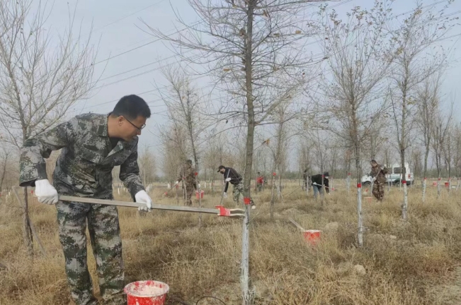 活动中,党员职工迅速行动、分工协作,有的手持工具细致粉刷树干,为树木筑牢越冬防护屏障;有的俯身清理枯枝落叶,全面清扫卫生死角,在消除安全隐患的同时,进一步净化了周边环境。大家配合默契、同心协力,以务实作风高效完成各项任务。经过共同努力,原本略显杂乱的林带变得整洁有序,绿化景观焕发出崭新面貌。