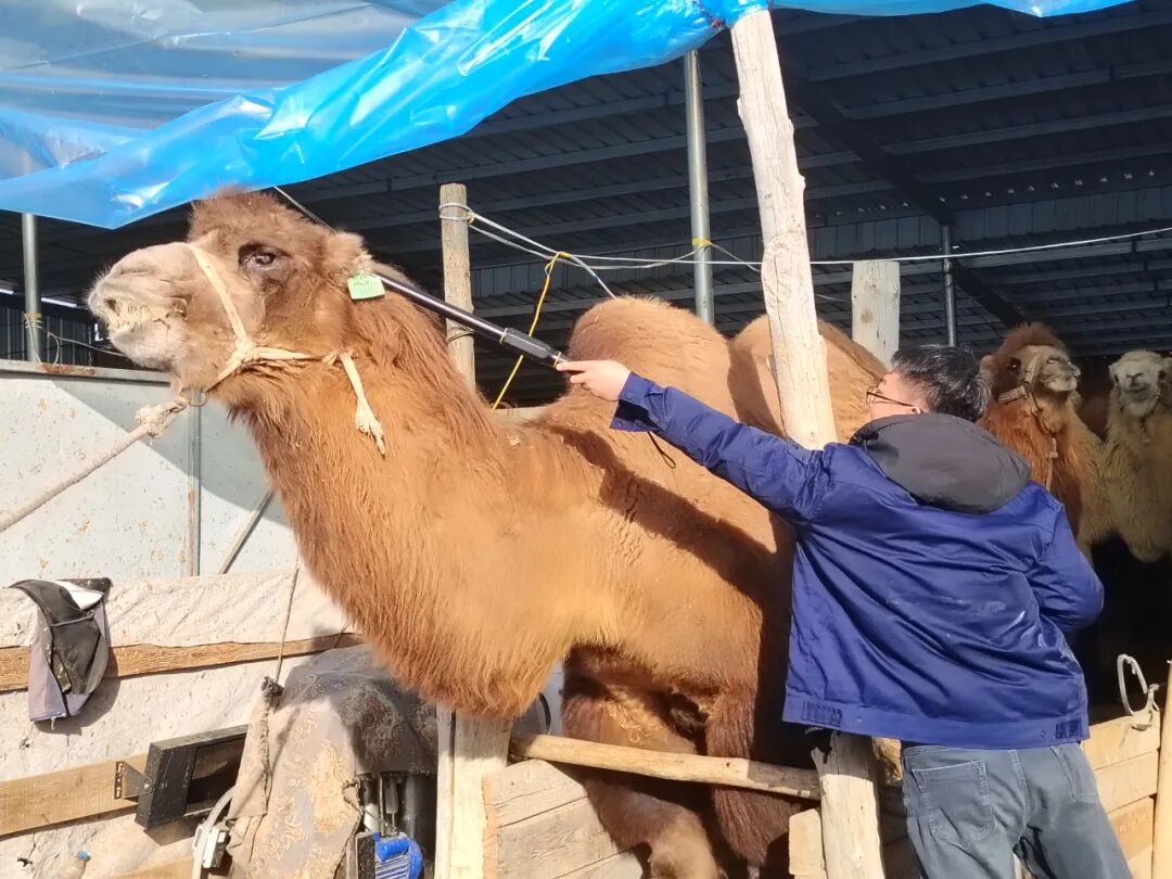11月18日,在五工台镇五工台村,保险公司工作人员正为村民哈那提家的骆驼植入电子芯片。通过专用注射器,米粒大小的芯片仅用十余秒便植入骆驼耳后。当天,哈那提家的200峰骆驼全部完成参保。