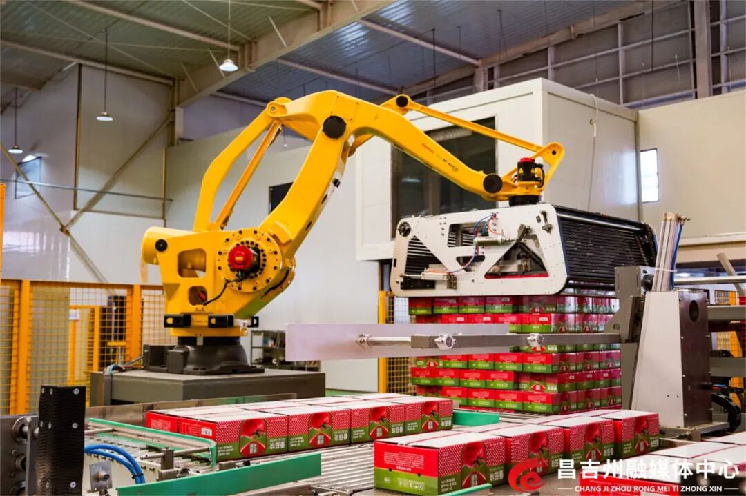 在新疆新茄食品有限责任公司生产车间,一台智能机器人正在打包番茄产品。资料图片