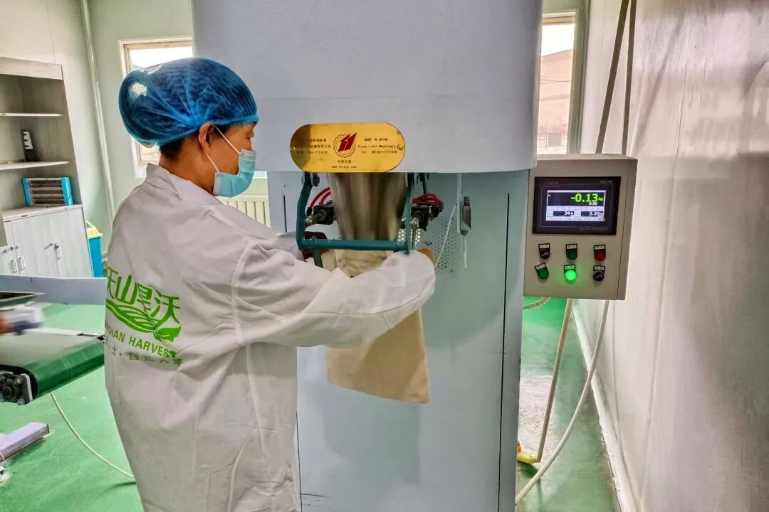 木垒县农家兄弟农业发展有限责任公司生产车间内,工人正在包装鹰嘴豆粉。木垒县农家兄弟农业发展有限责任公司供图