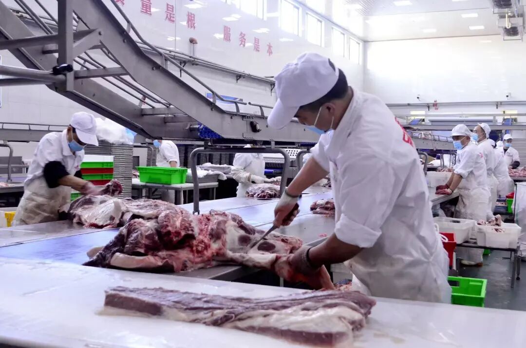 在新疆品高食品有限公司生产车间,工人们正在分割肉品。