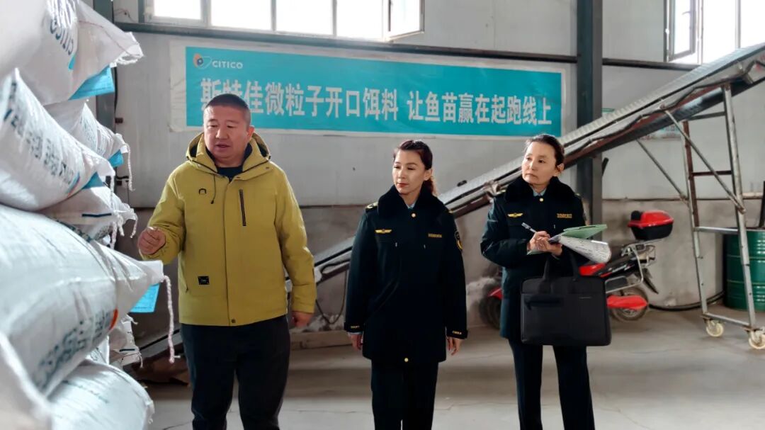 近日,在昌吉市鑫洋渔业专业合作社库房,昌吉州农业综合行政执法支队执法人员检查鱼饲料等投入品。记者王薇 摄