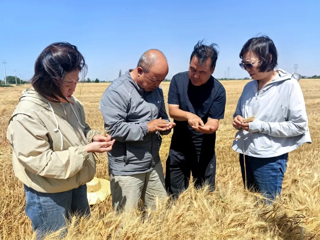 2025年7月16日,奇台县老奇台镇榆树沟村,专家们在麦田里查看麦穗的饱满程度。资料图片