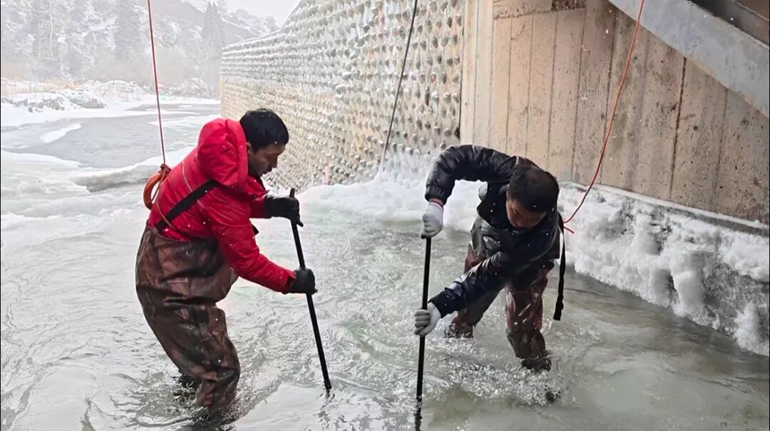 奇台县开垦河渠首管理站干部在闸口冰面进行人工凿冰作业。 李逸凡 摄