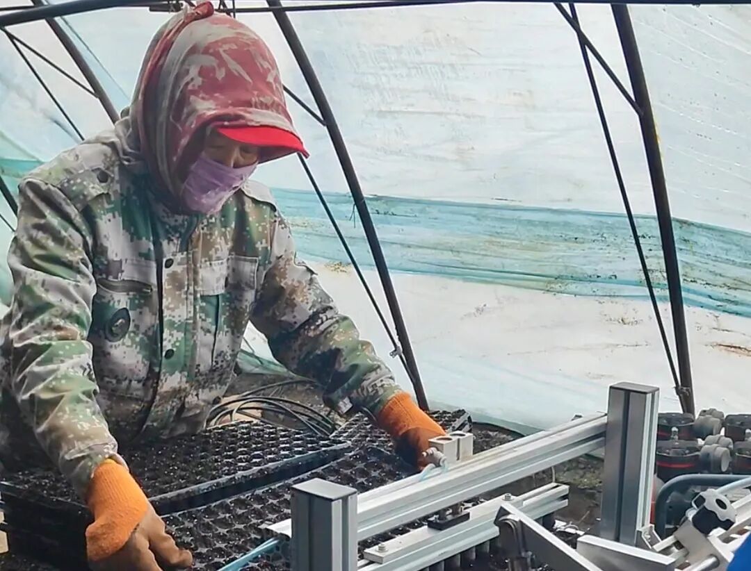 奇台县西北湾镇小屯村育苗大棚内农户在自动化育苗设备上作业 。赵文渤 摄