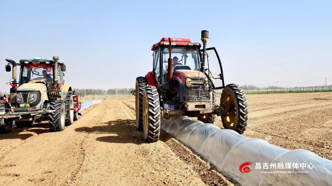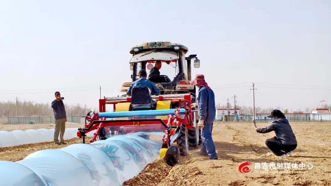 4月10日,一台悬挂式小拱棚自动架设机在田间穿梭,弯架、插架、覆膜、覆土一气呵成,一排排整齐规整的小拱棚铺展延伸,为新移栽的西瓜苗撑起生长的温室。这是昌吉州露地西瓜绿色轻简化高效栽培关键技术与机械装备现场观摩会中的一幕。