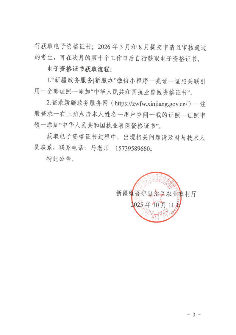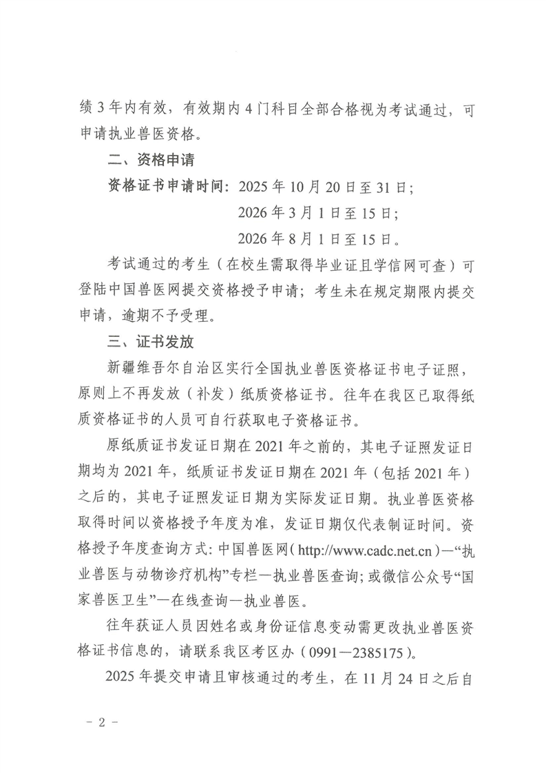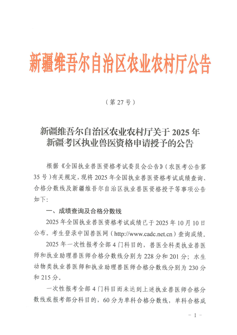 新疆维吾尔自治区农业农村厅关于2025年新疆考区执业兽医资格申请授予的公告