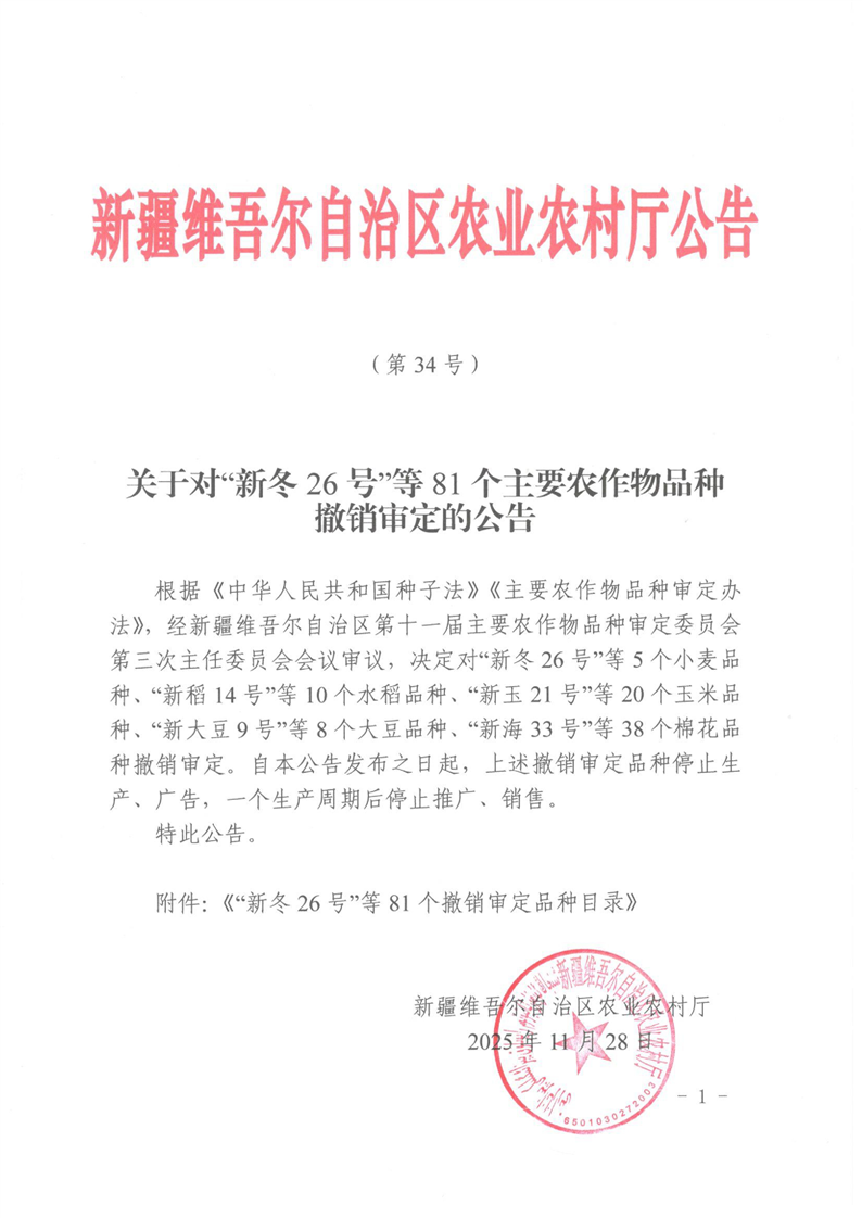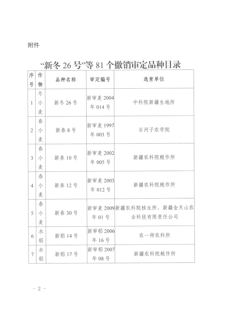 关于对“新冬26号”等81个主要农作物品种撤销审定的公告