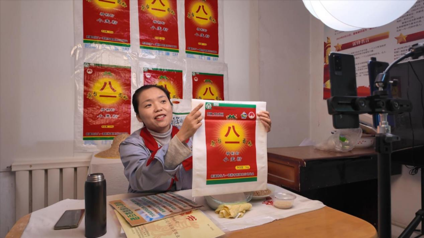 在新疆奇台八一面粉厂的直播间内,主播正面对镜头,生动讲解奇台面粉的独特品质。王丽摄