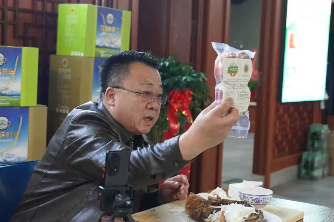 新疆胖巴依实业有限责任公司负责人刘雪青正在通过抖音直播间宣传推介奇台牛羊肉。李逸凡 摄